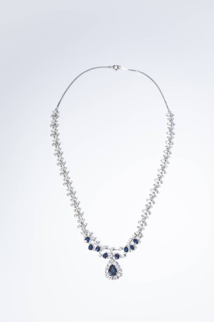 in oro bianco, al centro zaffiri taglio a goccia per totali ct 4,0 ca e diamanti taglio brillante per totali ct 1,0 ca.