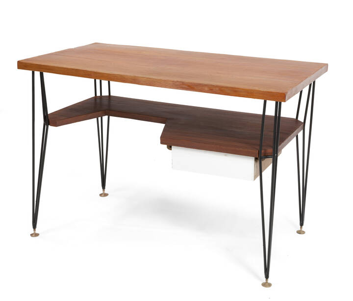 Scrivania con struttura in legno di mogano, ferro e formica. Piedi in ottone.