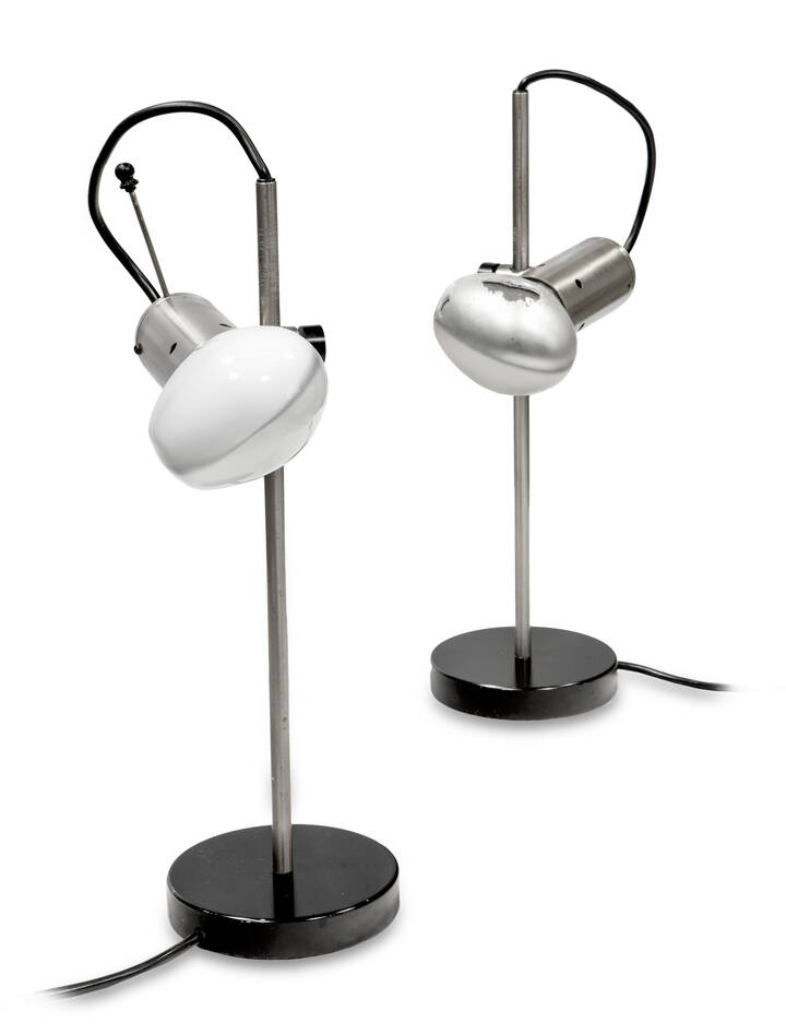 Coppia di lampade da tavolo in metallo cromato, diffurore regolabile in altezza.