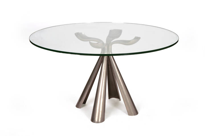 Tavolo in acciaio pressofuso, piano in cristallo con fascia perimetrale specchiata.
