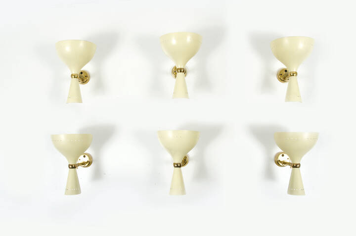Sei lampade a parete in ottone lucido con diffusore in metallo laccato orientabile.