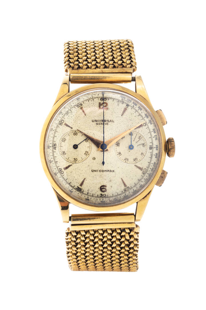 UNIVERSAL GENEVEMod. "UniCompax" a due contatori, ref. 124103, anni '50 Diam. 37 mm Cassa in oro giallo; fondello a pressione; quadrante con patina vintage; numeri arabi al 12 e al 6, indici applicati. Contatore secondi continui al 9, 45 minuti al 3. Tasti quadri della cronografia. Bracciale in oro giallo, lavorato a tessuto, non firmato Movimento a carica manuale, calibro 285 | |||