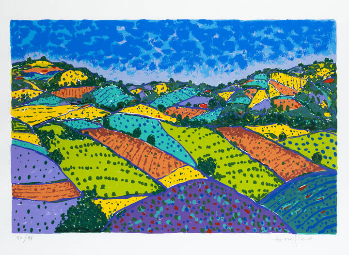 ETTORE FICOPiatto Biellese (VC) 1917 - 2004 Torino"Paesaggio collinare" 50x70 foglio, 38x58 litografia a colori, es. 50/99 Opera firmata in basso a destra e numerata in basso a sinistra (a matita sul foglio) | |||