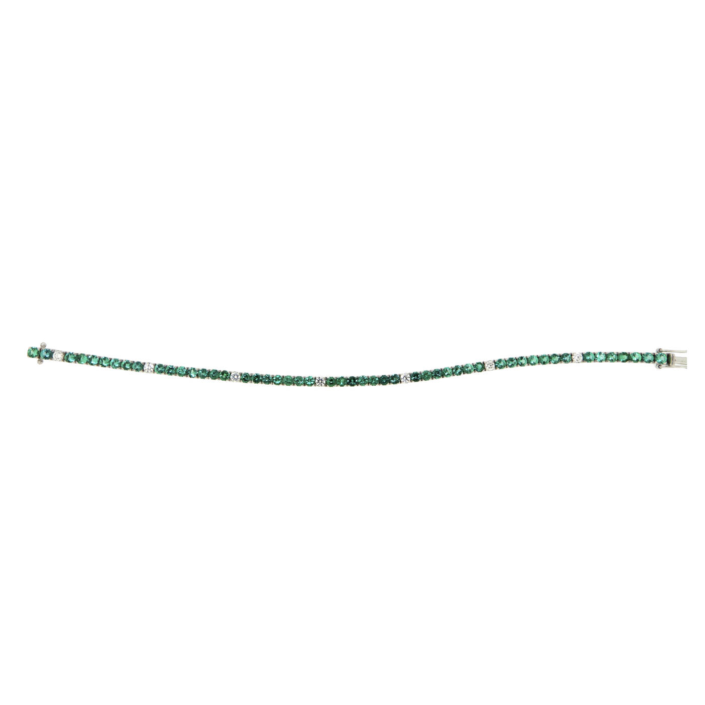 Bracciale in oro bianco, modello tennis, con cinquantuno smeraldi taglio rotondo e sei diamanti taglio brillante per complessivi ct 0,50 ca