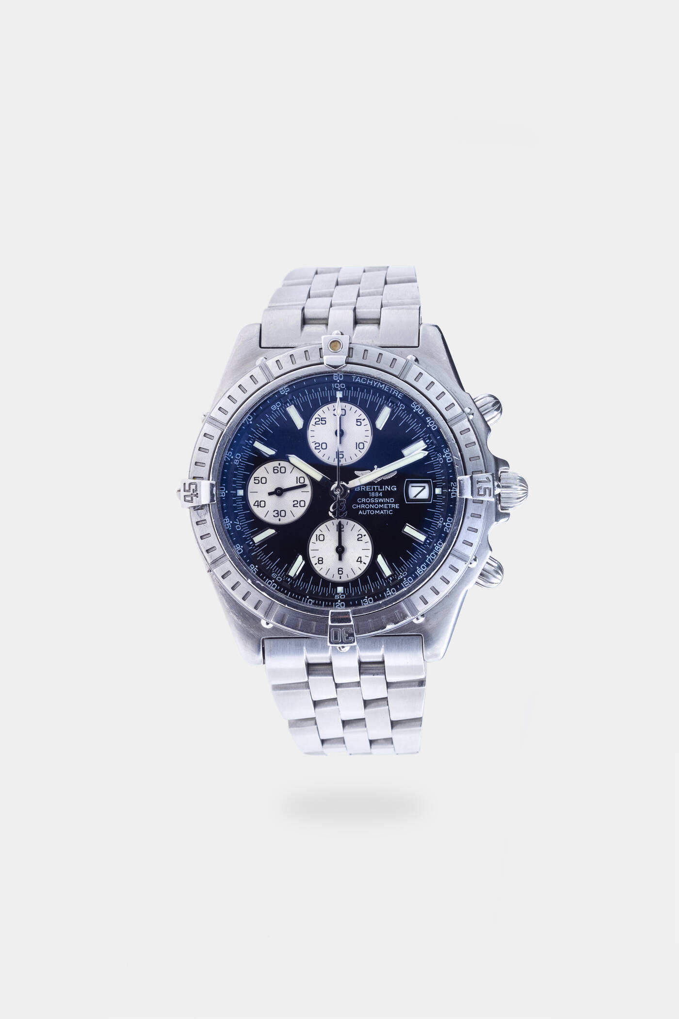 Mod. "Crosswind", ref. A13355, serie recente Diam. 44 mm Cassa in acciaio con lunetta girevole monodirezionale, fondello a vite e tasti a pompa della cronografia. Quadrante nero con indici geometrici luminescenti, datario al 3, contatore delle 12 ore al 6,dei secondi continui al 9 e dei 30 minuti al 12. Bracciale in acciaio integrato con chiusura clasp.