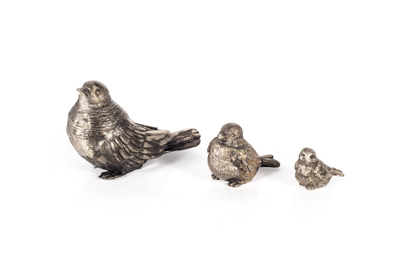Lotto di tre uccelli in argento di tre misure diverse; due firmati "M. Buccellati" e uno firmato "Gianmaria Buccellati"