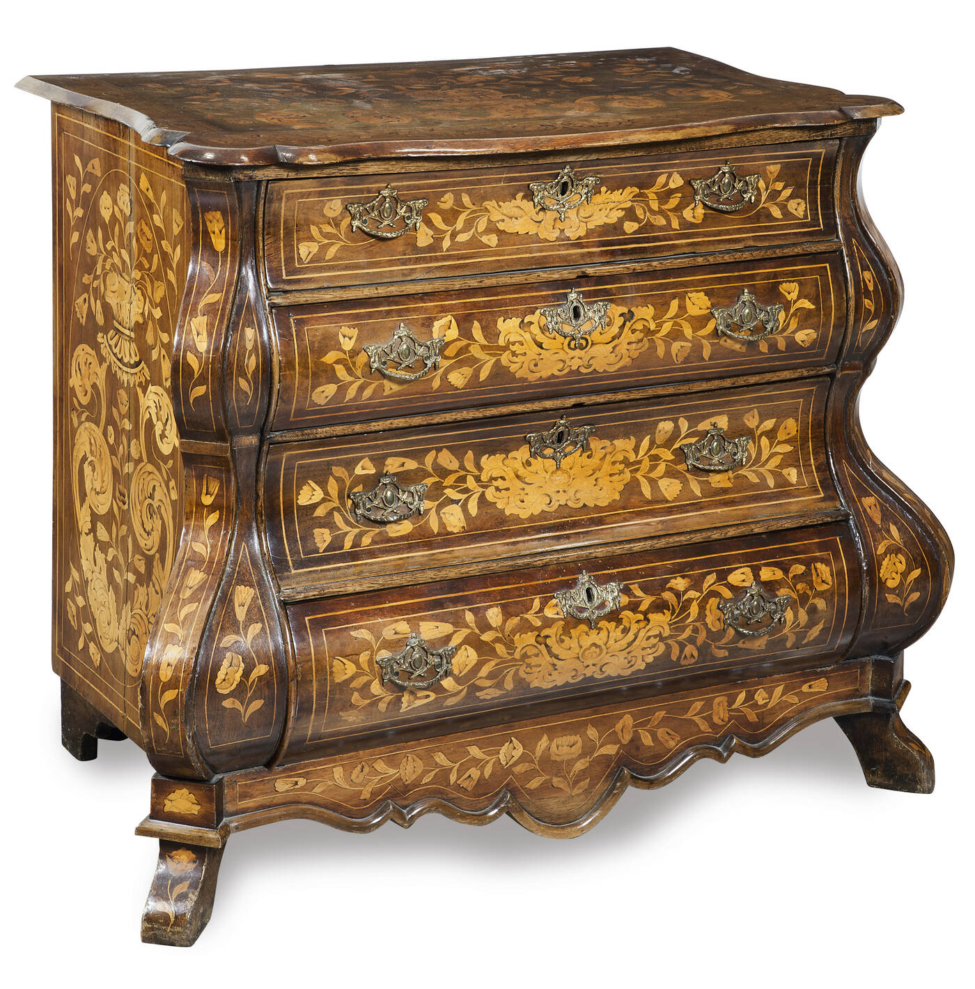 XVIII secolo, in noce con intarsi a motivi floreali in acero. Fronte mosso a 4 cassetti