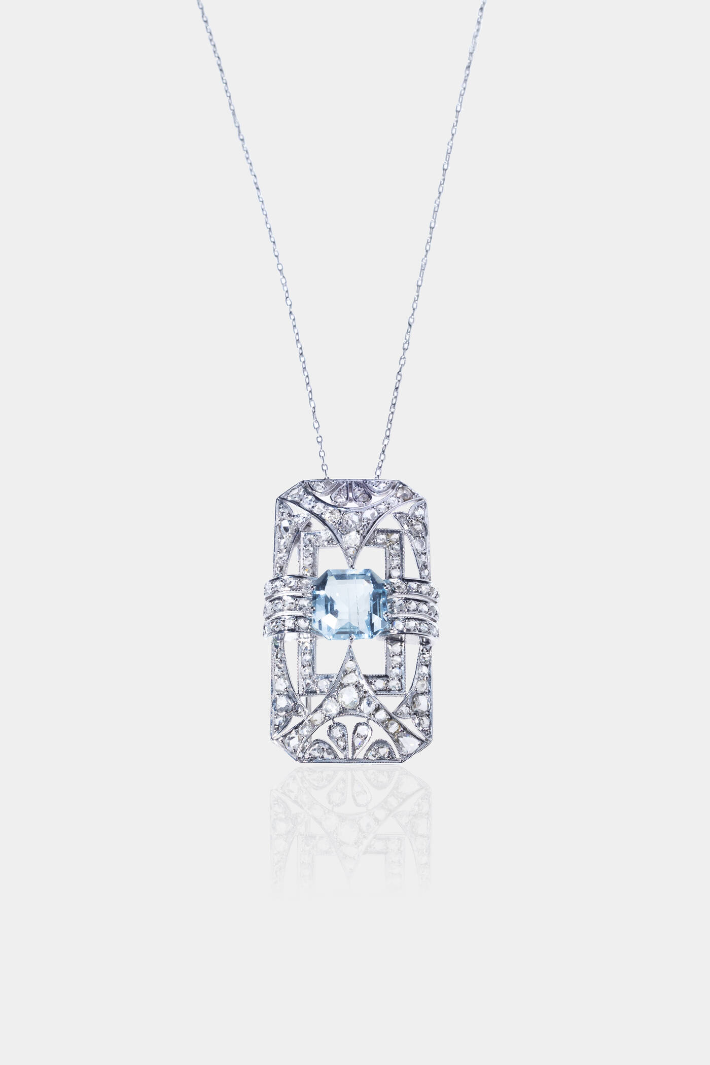 in oro bianco, di forma rettangolare con angoli smussati con al centro acquamarina taglio a cuscino e rosette di diamanti per totali ct 3, 0 ca