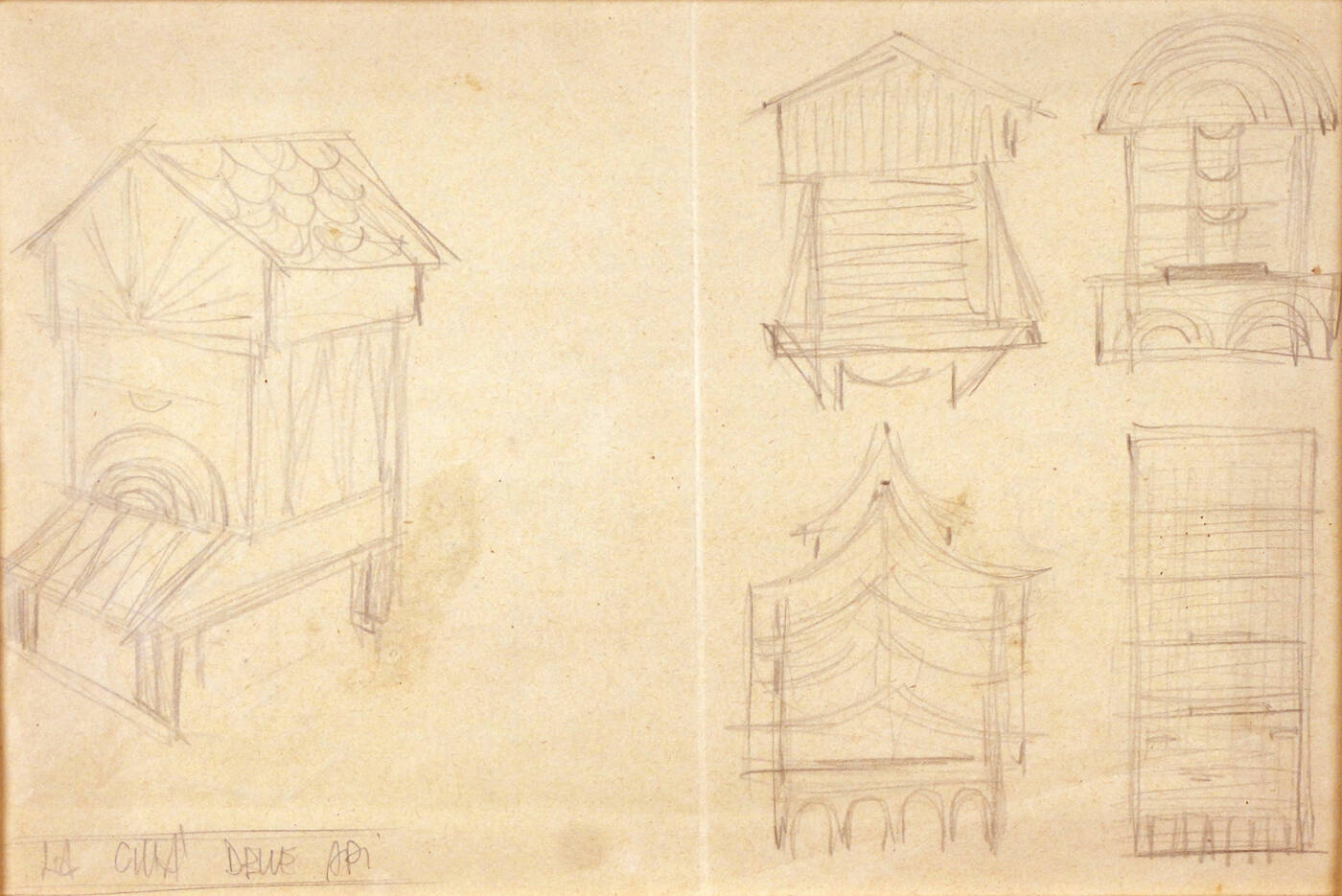 "Studio per la città delle api" 20x30 disegno a matita su carta Opera intitolata in basso a sinistra Al retro sono presenti altri disegni a matita per lo studio della Città delle Api