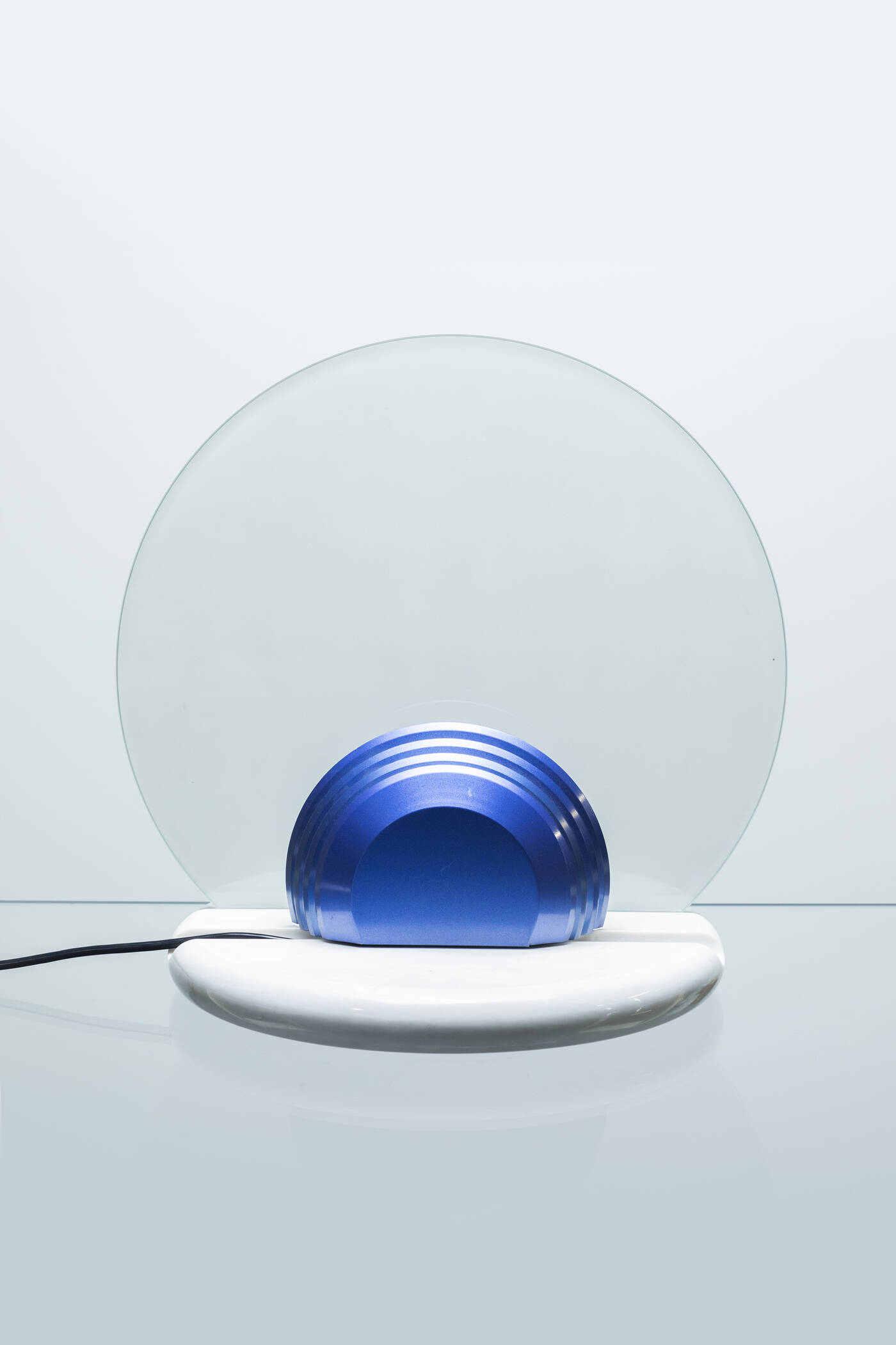 Diffusore in vetro satinato temperato, portalampada in alluminio verniciato, base in marmo.