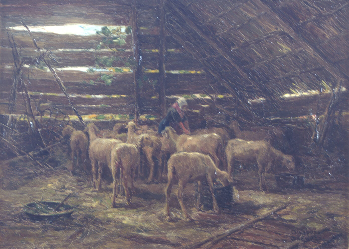 "Nell'ovile" 27x37 olio su tavola Opera firmata in basso a destra Già Galleria Fogliato, Torino (etichetta al retro)
