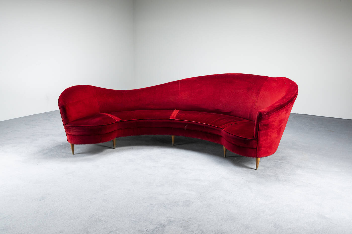Divano angolare con imbottitura rivestita in velluto, gambe coniche in legno.