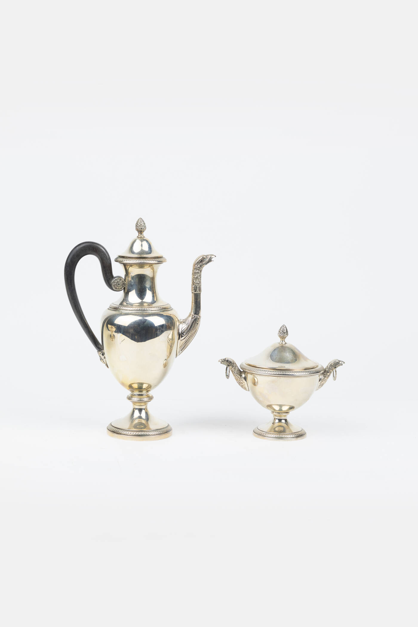 composto da caffettiera e zuccheriera, punzone Città di Torino, corpo bombato, basi circolari decorate a palmette; prese a pigna; versatoio a testa di aquila.