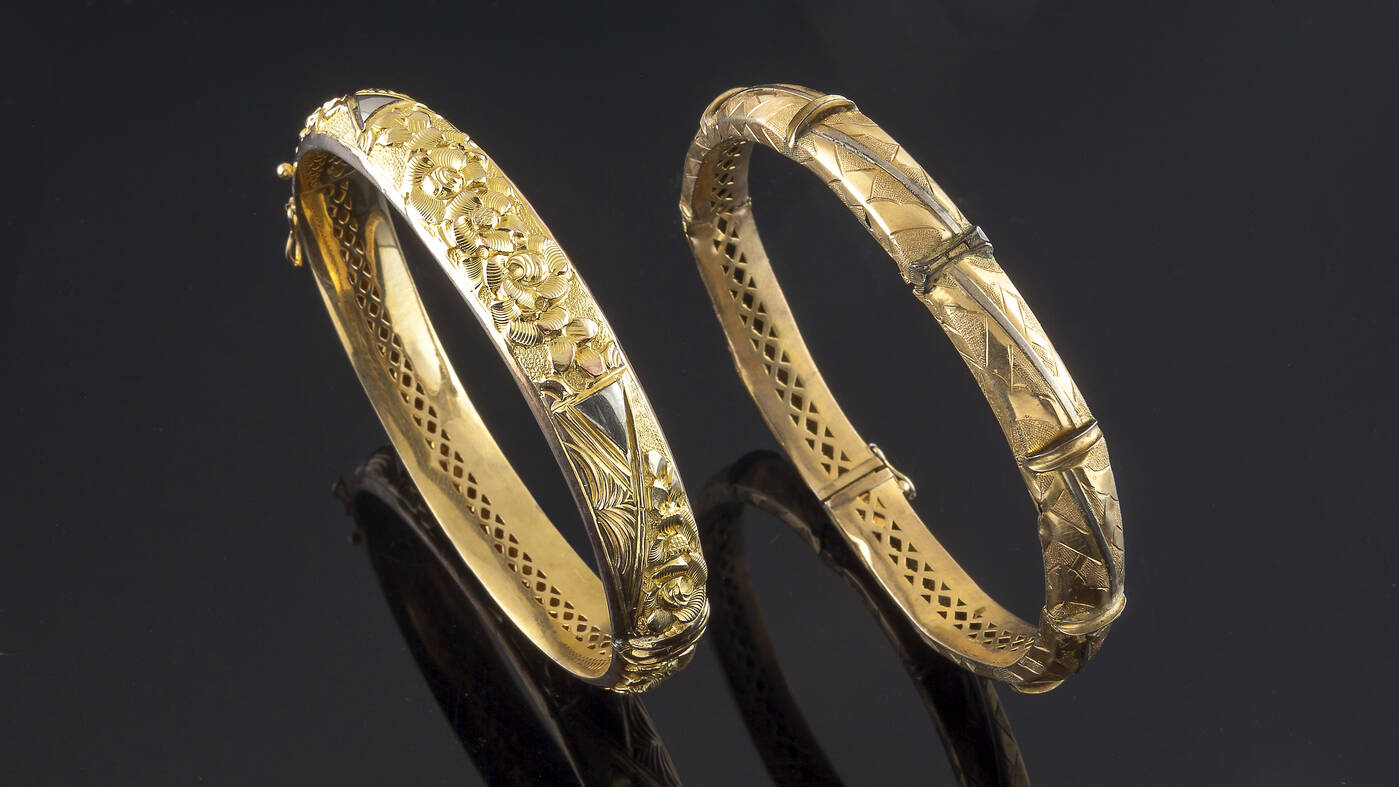 in oro giallo 14 Kt lavorati a canna vuota, anni '20, con decori floreali e fogliacei