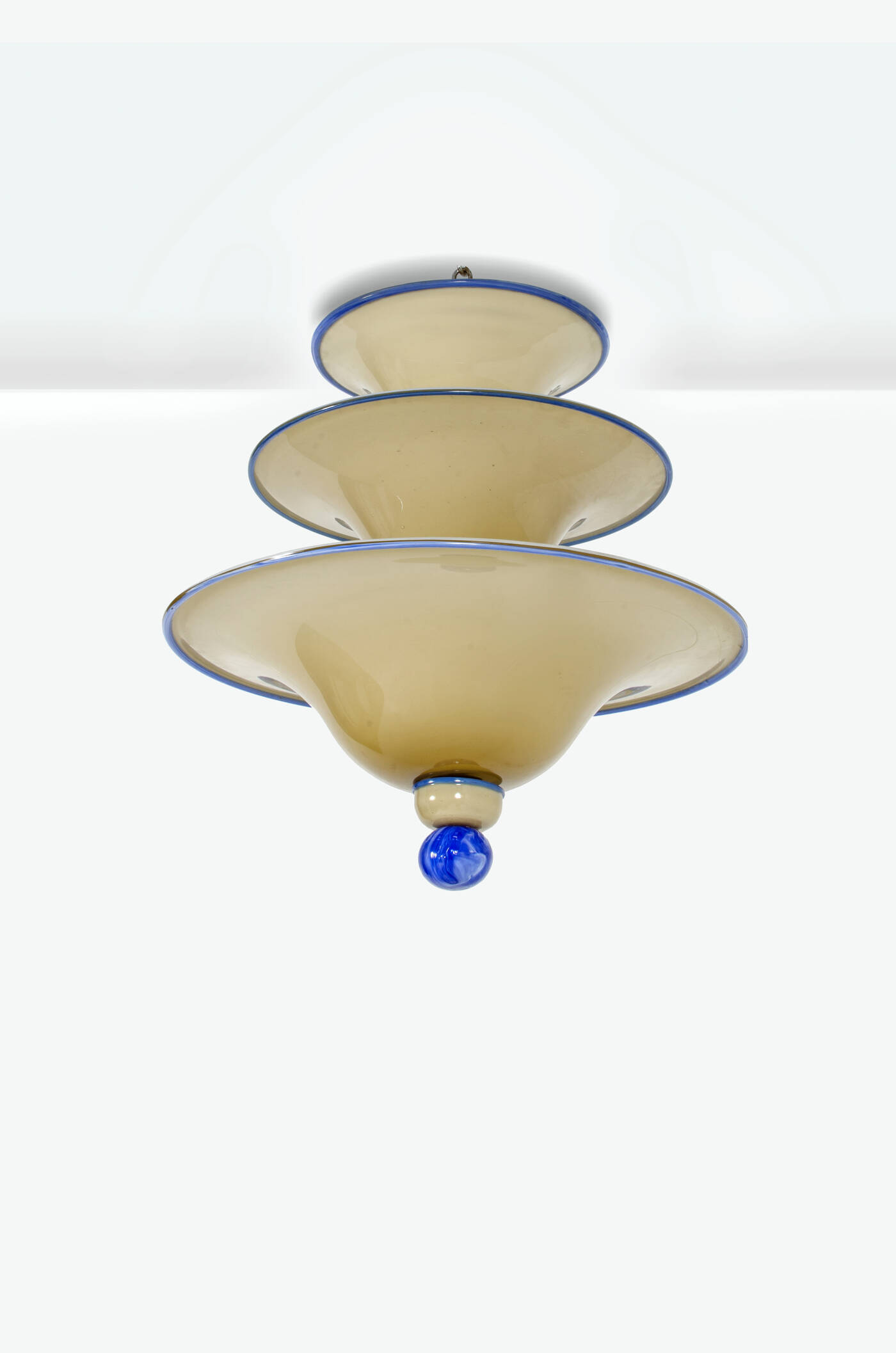 Lampada a sospensione formata da tre campane rovesciate sovrapposte in vetro pulegoso con finiture in vetro colorato.