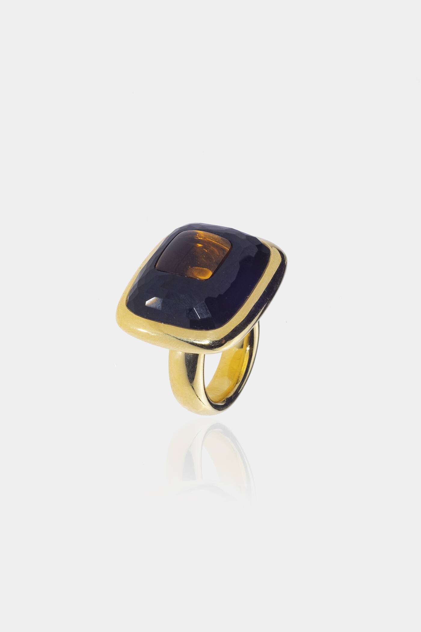 Anello in oro giallo, firmato "Pomellato", sommità squadrata e bombata con onice sfaccettato ed al centro quarzo citrino taglio cabochon