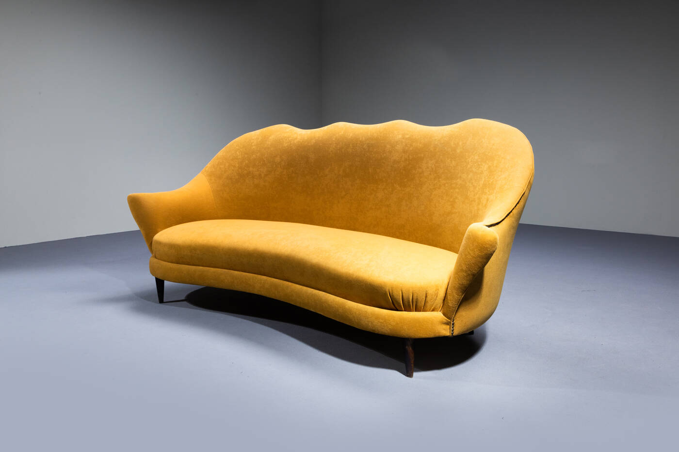 Divano con imbottitura rivestita in tessuto, gambe in legno.