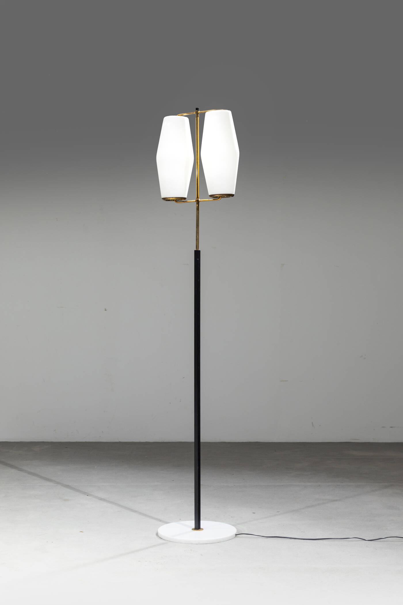 Struttura in metallo verniciato, ottone e diffusori in vetro opalino.