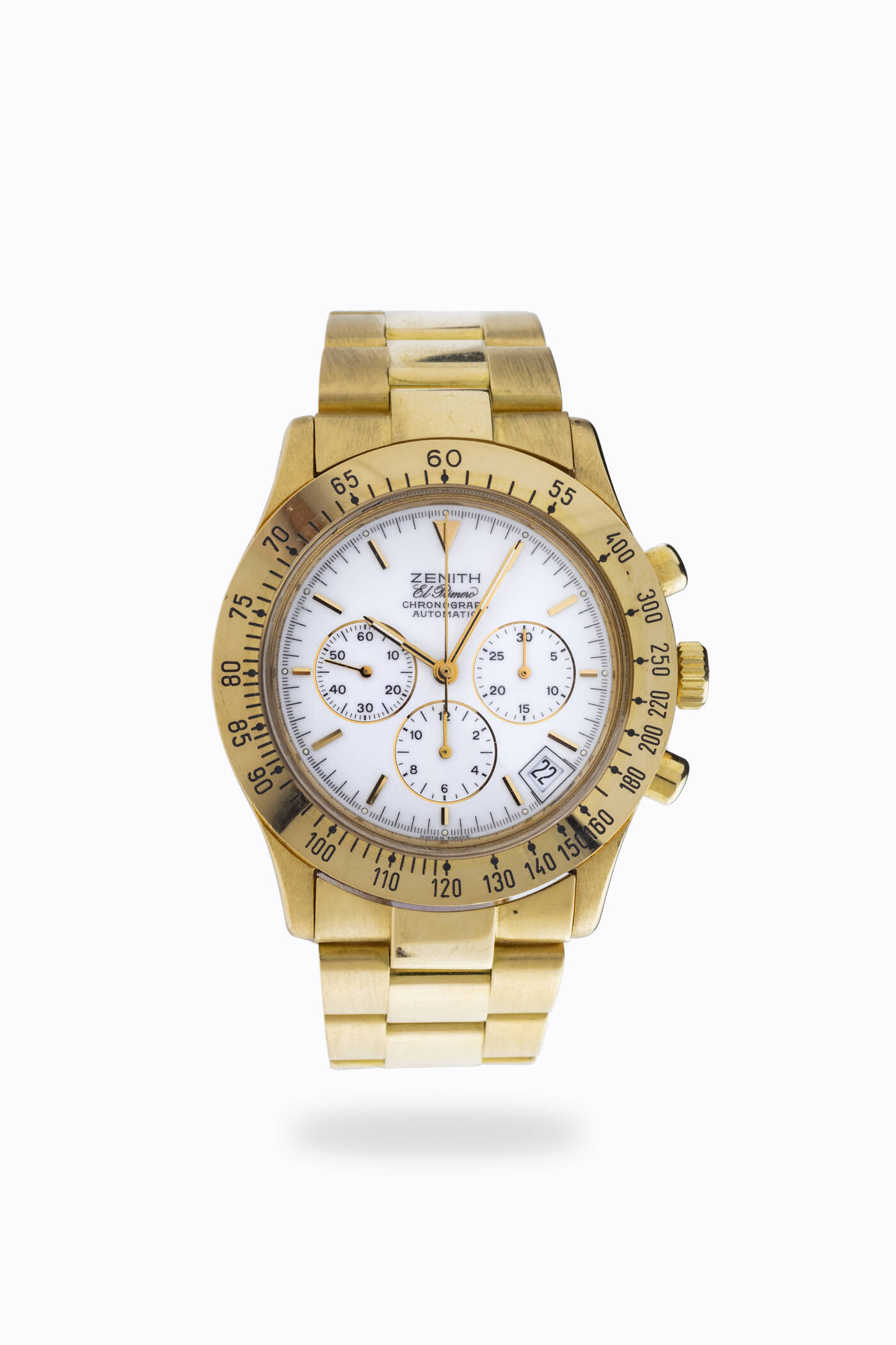 Mod. "El-Primero" ref. 06-0050-400 Diam. 40mm Cassa in oro con fondello a vite e lunetta tachimetrica. Quadrante bianco con indici geometrici applicati ed indicazione della data al 5